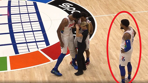 上半场最后3分钟,恩比德突破撞倒文班亚马吃到技术犯规,随后恩比德十分生气,暴怒并且怒喷裁判从而吃到技术犯规,之后恩比德更加生气,再次吃T,连吃两T被驱逐离场。