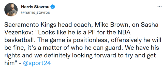 现年27岁的维岑科夫是左手将,身高2米06,体重102公斤,他在2017年选秀大会次轮总第57顺位被篮网选中,后来他的签约权在一笔涉及哈登的多方交易中被送到骑士,骑士又把他的签约权交易给国王。值得一提的是国王新帅迈克-布朗也来到欧洲杯现场观战,并在采访中谈到了维岑科夫的表现。