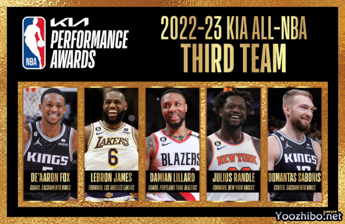 入选二阵的包括米切尔、巴特勒、库里、布朗、约基奇;入选三阵的包括福克斯、利拉德、詹姆斯、兰德尔、萨博尼斯。字母哥连续5年全票入选一阵!