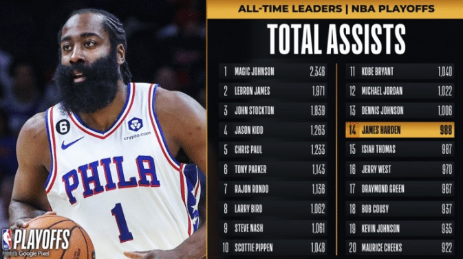 哈登不断的梳理进攻,他也迎来里程碑时刻,抢断反击助攻哈里斯完成扣篮,哈登的职业生涯季后赛助攻数超越以赛亚-托马斯独占历史第14位。