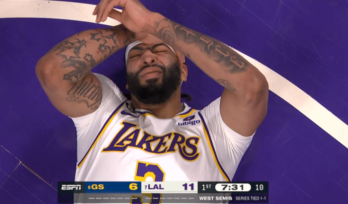 浓眉上半场三度重摔倒地