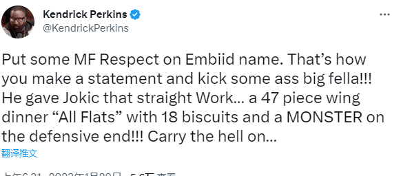 恩比德落选全明星首发后第一战就打出不可思议的表现,算是对无缘全明星首发的最直接的回应,对于恩比德的表现,名嘴帕金斯发推表示给恩比德这个名字TMD多点尊重!他就是这样发出了自己的声明!并狠狠地踢了一些大家伙的屁股,在直面约基奇的比赛中完成了统治级的表演!47分18篮板!在防守端也像个怪物!