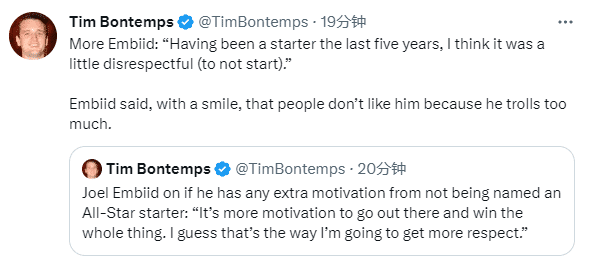 谈到落选全明星首发是否给予了自己额外动力时,恩比德说道:我更有动力去上场赢下比赛了,我想凭此(赢球)去获得更多尊重;过去5年我都是全明星首发,我认为落选有点不尊重人。
