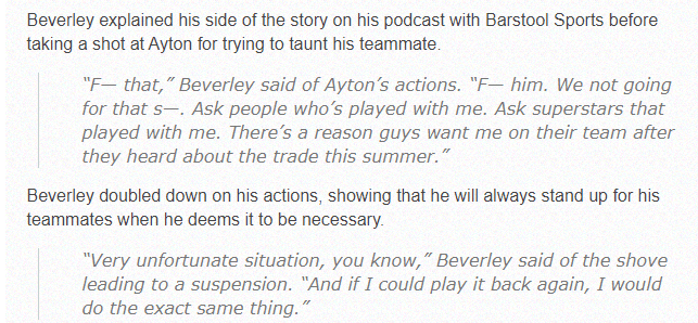 对于艾顿嘲讽队友的行为,贝弗利爆粗口表示:那就是揍他,问问和我一起打过球的人和超级球星,他们希望我加入他们的球队是有原因的。