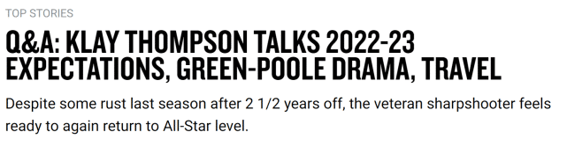 2021-22赛季,汤普森出战32场常规赛,场均20.4分3.9篮板2.8助攻。他还打了22场季后赛,场均19分3.9篮板2.3助攻。他认为自己在常规赛中的表现不稳定,季后赛打得很棒,关键球表现突出。对于自己上赛季的表现,他给自己打个A。“因为我在球场上所做的努力。休息了两年半之后,我依旧是冠军球队的第二得分手,我想不出来比这更好的结果了。”