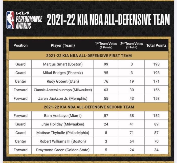 24直播网05月21日讯 ,NBA官方正式公布2021-22赛季最佳防守阵容,字母哥、布里奇斯、戈贝尔、斯玛特和小杰克逊入选最佳防守一阵;追梦格林、阿德巴约、霍乐迪、塞布尔和罗威入选最佳防守二阵,之后详细投票结果也出炉了。
