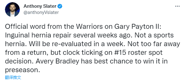 除了练兵之外,勇士还将通过季前赛来确定球队的第15人,勇士队记Anthony Slater表示:加里-佩顿二世几周前接受了腹股沟疝修复手术,将在一周内重新接受评估,很快可以复出,但球队很快要决定球队名单的第十五人,目前看来,布拉德利最有可能得到这个名额。