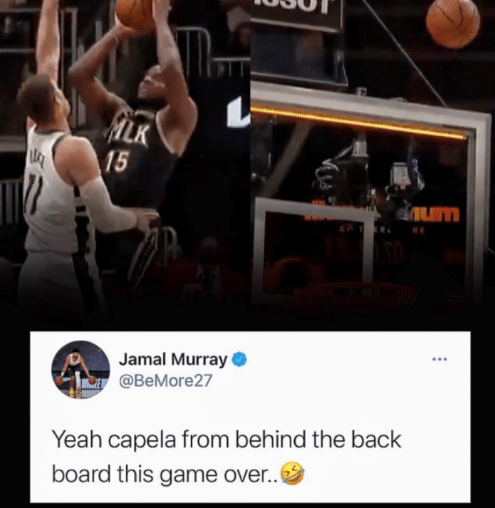 卡佩拉投进神仙球后,掘金球星穆雷第一时间发推:卡佩拉在篮板后投进了,这场比赛已经结束了。