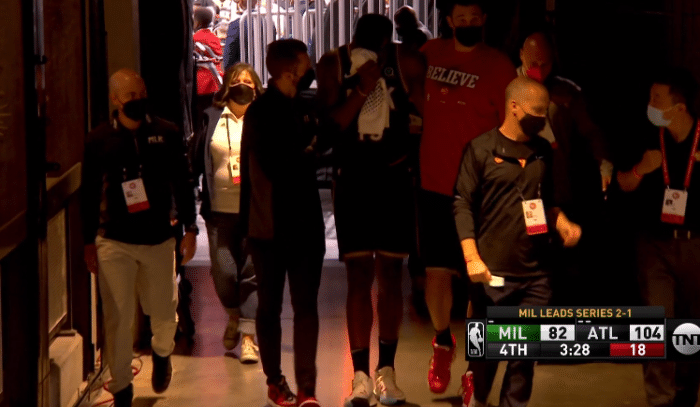 末节比赛早早沦为垃圾时间,不过卡佩拉在垃圾时间惨遭肘击,面部被肘击痛苦倒地,随后用毛巾捂着面部被搀扶离场;本场比赛伤病不断,字母哥膝盖过度伸展提前退赛,卡佩拉也受伤离场,但愿他们的伤势都无大碍。