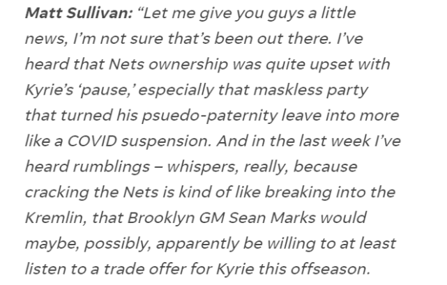 在最新一期播客节目上,Matt Sullivan说道:“我听说篮网管理层对于欧文在赛季期间的‘暂停(指离队事件)’感到非常不满,尤其是他参加了那个不戴口罩的派对,把所谓的陪产假变成了隔离。上周,我听到一些风声,篮网总经理肖恩-马克斯在休赛期可能至少愿意听取关于凯里(欧文)的报价。”