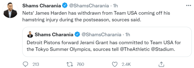 24直播网讯 北京时间6月24日,据NBA名记查拉尼亚报道,美国男篮的奥运会12人名单已经出炉。公牛球星拉文将加入球队,哈登因腿筋伤势退出,活塞的杰拉米-格兰特顶替哈登入选。