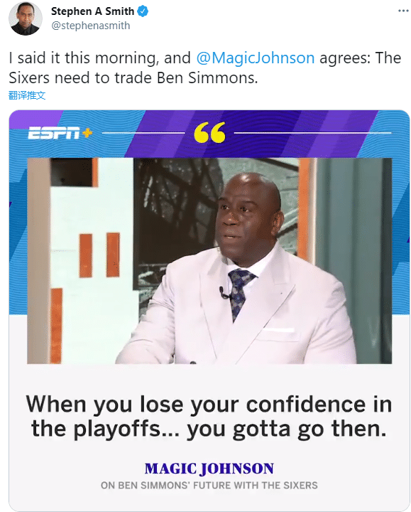 24直播网讯 名嘴“美国杨毅”直言本-西蒙斯必须离队,湖人名宿魔术师同意A-史密斯的观点,直言:当你在季后赛失去信心时,你就必须走了;魔术师认为76人需要交易西蒙斯。