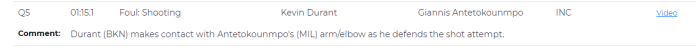 加时赛剩下1分15秒,篮网111-109领先,字母哥篮下单打杜兰特勾手命中,裁判报告显示,杜兰特在防守对手时打到了字母哥手臂,应该吹罚防守犯规,字母哥加罚一球。然而这一球实际上是连锁效应,因为格里芬被错判六犯离场,导致字母哥在篮下打进。