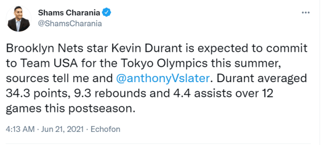 24直播网讯 北京时间6月21日,据名记查拉尼亚报道,篮网前锋凯文-杜兰特计划加入美国男篮,承诺出战东京奥运会。杜兰特在今年季后赛状态神勇,打了12场比赛,场均贡献34.3分9.3篮板4.4助攻。