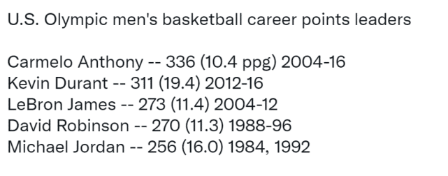 数据显示,杜兰特目前排在美国男篮奥运得分榜的第二位。他有望在这一届东京奥运上超越安东尼,成为历史第一得分手。安东尼目前总计为美国奥运男篮拿到336分,杜兰特是311分。詹姆斯273分排名第三,大卫-罗宾逊270分排名第四,迈克尔-乔丹256分位居第五。