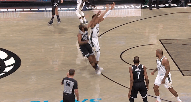24直播网讯 垫脚,又是垫脚,字母哥在篮网队对阵雄鹿队的东部半决赛系列赛中交出的不是亮眼的数据,而是接连的两次垫脚。