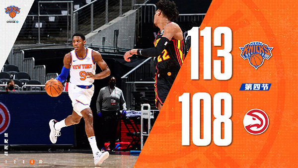 24直播网讯:北京时间2021年1月5日消息,在一度落后15分的劣势下,纽约尼克斯队客场最终以113-108逆转亚特兰大老鹰队,尼克斯迎来2连胜。
