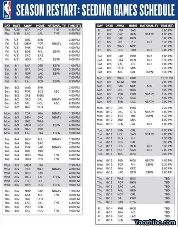 NBA官网今日公布了复赛后的常规赛赛程,比赛将于美国当地时间7月30日(北京时间31日)至8月14日在奥兰多的迪士尼进行。复赛日两场揭幕战分别是爵士对阵鹈鹕以及湖人与快船的洛城德比。