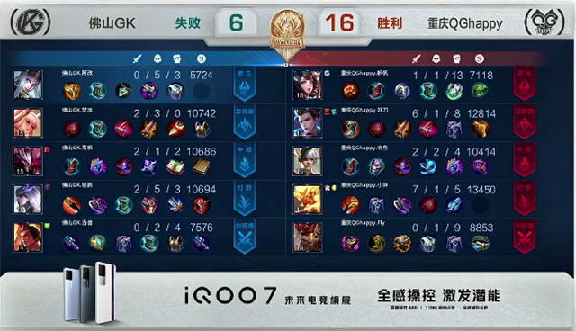 双方平稳开局。1分50秒上路团战,佛山GK打出1换2,兰陵王拿下一血。3分30秒裴擒虎拿下主宰,橘右京拿下暴君。4分钟下路团战,佛山GK推掉下路一塔,鲁班大师被击杀。5分20秒重庆QGhappy入侵野区,裴擒虎被击杀。5分30秒李元芳推掉下路一塔。6分20秒野区团战,重庆QGhappy打出1换2。7分钟,裴擒虎拿下主宰。7分30秒橘右京拿下暴君。9分10秒上路团战,佛山GK打出1换2。9分50秒河道团战,重庆QGhappy打出1换2。10分26秒橘右京被击杀。10分40秒裴擒虎拿下主宰。11分10秒橘右京拿下暴君。15分20秒裴擒虎拿下主宰。15分50秒中路团战,双方1换1。16分35秒裴擒虎拿下暴君。19分05秒下路团战,双方1换1。19分50秒下路团战,佛山GK打出1换3。20分30秒重庆QGhappy边路高地塔被破。21分钟裴擒虎拿下风暴龙王。21分45秒狄仁杰推掉中路高地塔。22分16秒佛山GK推掉水晶扳回一分。