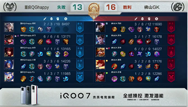 双方和平开局。3分25秒王昭君拿下一血。3分40秒娜可露露拿下暴君。5分钟中路团战,双方1换1。5分20秒老夫子推掉上路一塔。7分钟蒙犽推掉下路一塔。8分钟娜可露露拿下暴君。10分钟佛山GK推掉中路一塔。10分47秒鲁班七号拿下暴君。11分40秒娜可露露拿下主宰。13分钟中路团战,佛山GK打出1换3。佛山GK顺势一波推掉中路高地塔,马超被击杀,双方1换1。16分钟野区团战,老夫子被击杀。16分30秒娜可露露拿下暴君。16分45秒中路团战,重庆QGhappy团灭佛山GK,重庆QGhappy顺势下路一波直推水晶。17分14秒重庆QGhappy推掉水晶拿下本场比赛胜利。