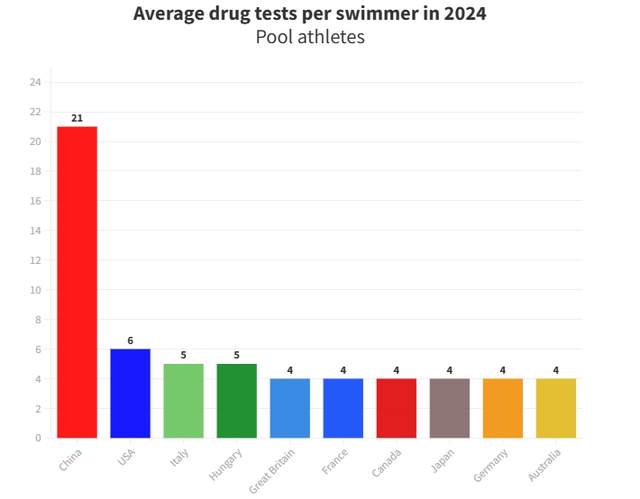 世界泳联文件还显示,被看好在女子100米蛙泳金牌的中国选手唐钱婷自今年年初以来已经接受了23次测试,这是世界上测试次数最多的。还有队友王浩宇、季新杰、杨俊轩和程玉洁也接受了很多的检测。200米蛙泳世界纪录保持者覃海洋,在2023年接受了46次检测,而今年他也已经接受21次检测。