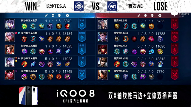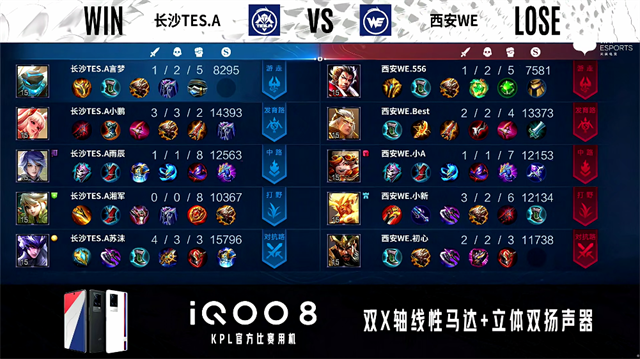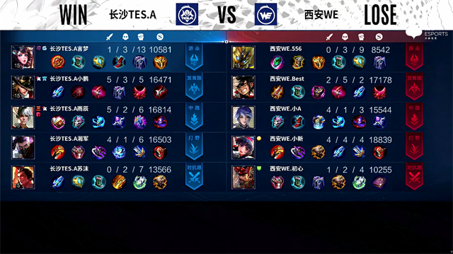 48秒,西安WE关羽击杀马超拿下一血。2分31秒,长沙TES.A控下暴君。2分56秒,西安WE下路击杀公孙离。3分36秒,西安WE下路越塔击杀公孙离。4分20秒,长沙TES.A阿古朵控下先知主宰。5分06秒,西安WE破掉长沙TES.A下一塔。5分52秒,西安WE下路打出0换2。6分11秒,西安WE破掉长沙TES.A中一塔并击杀马超。7分47秒,双方团,长沙TES.A打出1换3。8分27秒,长沙TES.A破掉西安WE上一塔。9分57秒,西安WE破掉长沙TES.A中二塔并击杀弈星。11分44秒,西安WE控下暗影暴君。12分55秒,西安WE破掉长沙TES.A上二塔。13分44秒,西安WE控下暗影主宰。14分46秒,西安WE破掉长沙TES.A上高地。15分06秒,西安WE破掉长沙TES.A下二塔。16分10秒,西安WE控下暗影暴君,随后长沙TES.A击杀关羽。20分38秒,长沙TES.A拿下风暴龙王,随后团战长沙TES.A打出0换5并破掉西安WE中路三塔。21分21秒,长沙TES.A摧毁西安WE水晶再下一城。