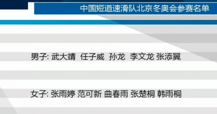 24直播网01月15日讯 ,北京冬奥会中国短道速滑名单正式出炉,男队由武大靖领先,其他的4人为:任子威、孙龙、李文龙、张添翼。女队由老将范可新带队,她在选拔赛第二站之后获得参赛席位,其他的选手为:张雨婷、曲春雨、张楚桐、韩雨桐。