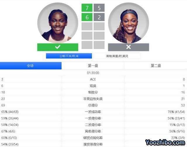 第二盘高芙一上来就遭到破发,随后她迅速回破追至1-1。第4局高芙再破对手发球局,取得3-1的优势。第5局比赛高芙挽救3个破发点顽强保发,第6局高芙再破对手发球局,5-1来到发球胜赛局。第7局高芙发球胜赛局失守,斯蒂芬斯破发追至2-5。第8局高芙再破对手发球局,6-2拿下了第二盘比赛的胜利。