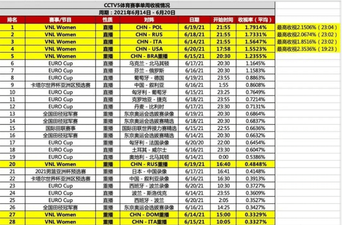 值得一提的是第五名依旧是中国女排的比赛,而这还是重播中国女排大逆转巴西队的比赛,重播的收视率都比如今正在如火如荼进行的欧洲杯的收视率还要高,确实是创造了历史。