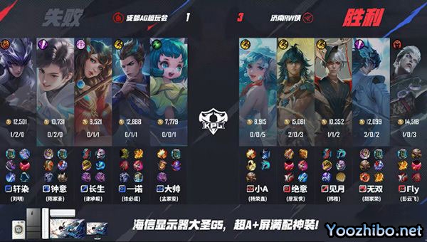 第二局,九分钟红区RW关羽侧面进场推掉了AG射辅,14分钟龙团姬小满没有拦住关羽进场,一脚踩到三个AG瞬间融化打了一波团灭后RW点掉水晶,连赢两局!本局MVP为RW侠Fly (彭云飞)关羽!
