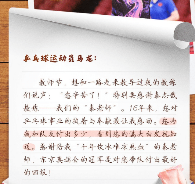 24直播网9月10日讯 ,是一年一度的教师节。这个日子,是属于所有老师的节日。对于乒乓球运动员马龙来说,他的教练们就是他的老师。在这个日子,马龙也写下亲笔信,向所有指导过他的教练,特别是秦志戬教练,送上了节日祝福。