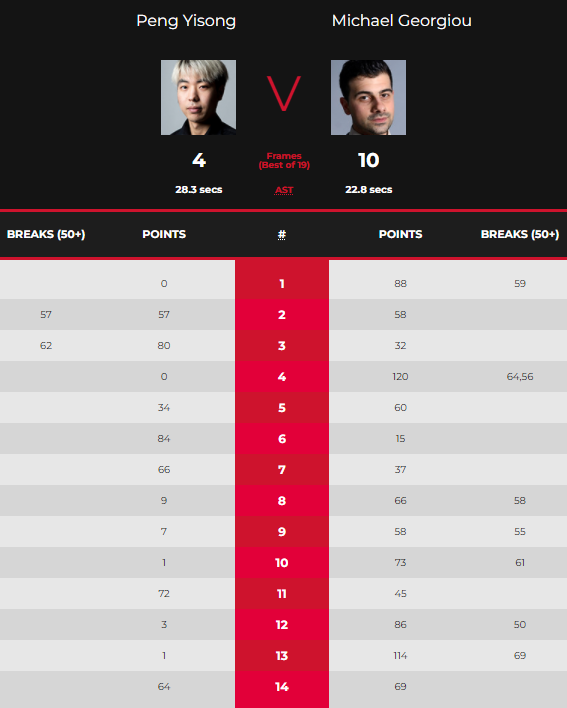 北京时间4月5日,刚刚结束的2023斯诺克世锦赛资格赛第1轮中,彭奕淞面对业余身份参赛的迈克尔-乔治乌,仅仅打出两杆50+,对手交出8杆50+的数据,总比分4-10惨败对手。