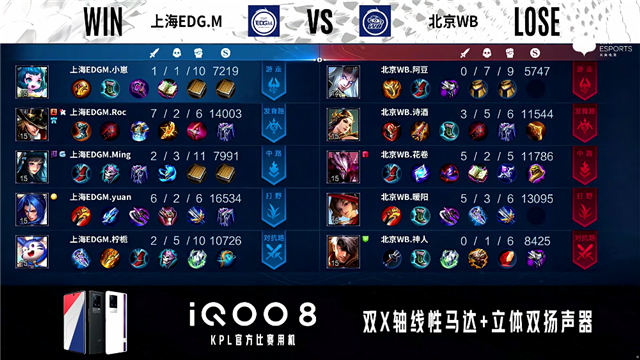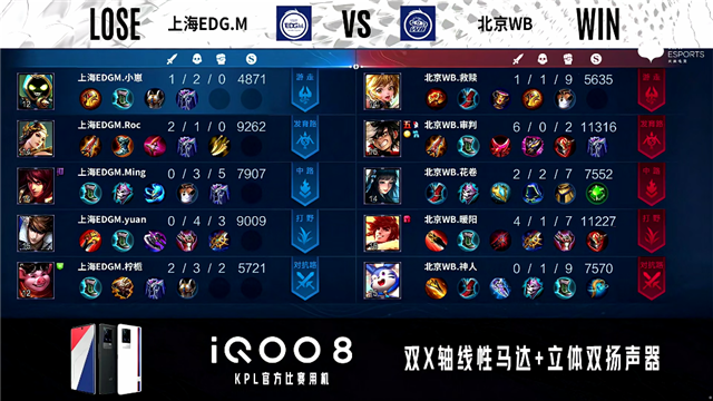 1分27秒,上海EDG.M马可波罗击杀虞姬拿下一血。2分48秒,北京WB控下暴君。3分35秒,双方两处交火,上海EDG.M最终打出1换2。4分05秒,北京WB破掉上海EDG.M上一塔。4分24秒,北京WB中路打出0换2。4分42秒,北京WB控下先知主宰。5分45秒,上海EDG.M击杀东皇太一。6分35秒,北京WB击杀西施。7分09秒,河道团,北京WB打出0换3并控下暴君。8分钟,双方中路1换1。8分52秒,北京WB拿下先知主宰。10分14秒,双方团,上海EDG.M打出0换2。10分42秒,北京WB击杀马可波罗,上海EDG.M控下暗影暴君。12分54秒,野区团,北京WB打出1换2。13分21秒,北京WB击杀西施。14分12秒,北京WB控下暗影主宰。15分04秒,双方团,上海EDG.M打出1换3,橘右京拿下双杀。15分30秒,上海EDG.M破掉北京WB中路两座外塔。15分45秒,上海EDG.M破掉北京WB上高地并击杀云缨。17分18秒,上海EDG.M破掉北京WB下二塔。18分12秒,双方团,上海EDG.M打出1换5,马可波罗拿下四杀,随后摧毁北京WB水晶赢下比赛。
