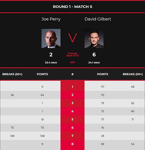 15分钟局间休息后,第5局中 红球堆被打散后乔佩里率先上手,连得19分后进攻中断,防守争夺中乔佩里失误不慎将袋口粉球撞摔袋,吉尔伯特打进一杆长台再度上手,围球完成单杆71分制胜,总分来到5-0领先来到赛点。第6局中,吉尔伯特长台上手拿下16分后打丢中袋红球,错失了一杆锁定胜局的机会,乔佩里随后围球完成单杆73分超分制胜,挽救一个赛点1-5落后。