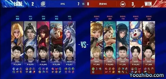 第五局,XYG蓝色方,拿到了赵怀真+戈娅。西安WE红色方,拿到了梦奇+虞姬。开局XYG击杀梦奇,拿下一血。7分钟,XYG直推中路一塔。14分钟,XYG经济差拉开五千。决胜团,西安WE虞姬输出拉满,一波团灭XYG,虞姬拿下五杀,直推水晶,拿下最终胜利。
