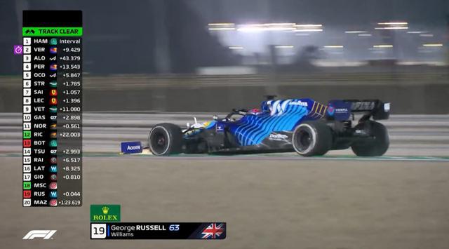 一圈过后,威廉姆斯的另一辆车手拉蒂菲也出现爆胎,赛道上出示黄旗,直接将赛车开进缓冲区,退出了比赛。倒数第2圈,由于拉蒂菲的赛车需要吊车拖走,赛会出动了虚拟安全车,维斯塔潘马上由进站更换了一次轮胎,来保持最快单圈的优势。最后一圈,虚拟安全车结束,汉密尔顿率先撞线,拿下卡塔尔大奖赛冠军,维斯塔潘获得亚军,阿隆索收获季军。佩雷兹、奥康、斯托尔分别排在4-6位。