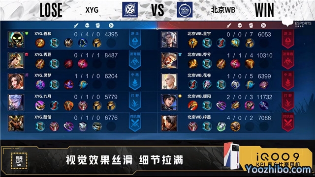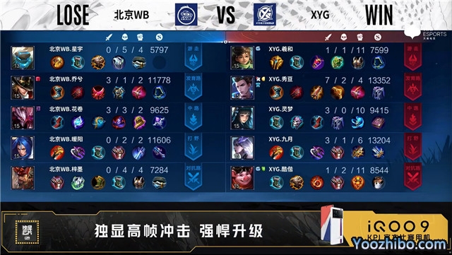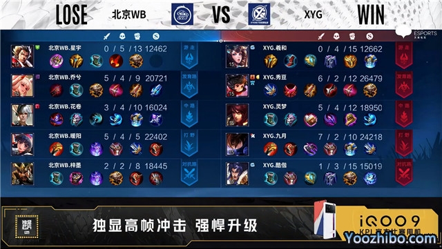 双方常规开局。4分11秒XYG中路击杀张飞拿到一血。4分37秒北京WB发育路击杀大乔。5分40秒XYG摧毁敌方对抗路外塔。6分06秒野区团战北京WB打出0换3。7分03秒北京WB拿下暴君。9分06秒娜可露露拿到主宰。9分21秒发育路团战双方1换1。9分36秒北京WB摧毁敌方对抗路二塔。10分18秒北京WB拿下暗影主宰。10分52秒北京WB拿下暗影暴君。11分22秒北京WB摧毁敌方发育路二塔。12分02秒中路团战北京WB打出0换2。13分17秒北京WB摧毁敌方中路高地塔。13分27秒北京WB摧毁敌方发育路高地塔。14分整北京WB拿下暗影主宰。14分38秒北京WB拿下暗影暴君。15分36秒北京WB摧毁敌方对抗路高地塔。16分11秒高地团战XYG打出2换5,李元芳拿到四连超凡。18分15秒中路团战XYG击杀公孙离。18分26秒XYG拿下暗影主宰。18分54秒XYG拿下暗影暴君。20分45秒北京WB拿下风暴龙王,团战XYG打出2换3。23分56秒发育路团战双方2换2。25分41秒XYG抢到风暴龙王,团战北京WB打出1换2。28分28秒XYG暴君处击杀嬴政。29分19秒XYG拿下风暴龙王并击杀娜可露露。30分32秒XYG摧毁敌方中路、对抗路高地塔。31分19秒XYG对抗路打出0换3。31分30秒XYG摧毁敌方水晶拿下比赛。
