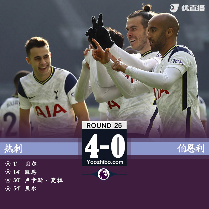 24直播网讯 北京时间2月28日22:00,英超第26轮继续进行,热刺坐镇主场迎战伯恩利。上半场开场68秒,贝尔接孙兴慜助攻打进闪电进球帮热刺取得领先,此球为英超球队对阵伯恩利的最快进球,随后贝尔又送出长传助攻凯恩扩大比分,雷吉隆助攻小卢卡斯再入一球。下半场,贝尔再次接孙兴慜助攻完成双响。最终,热刺4-0大胜伯恩利,结束两连败。