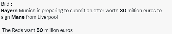 《图片报》指出,拜仁已经准备开出3000万欧元的报价求购这位塞内加尔国脚,但利物浦希望能够获得5000万欧元转会费。除了拜仁之外,巴黎圣日耳曼也在密切关注马内的动态。