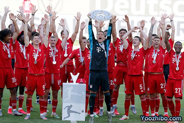 北京时间06月27日结束的德甲第34轮的比赛中,拜仁以积分82分排名第一,比第二名的多特蒙德高出13分,拜仁获得2019-2020德国甲级联赛冠军,而这一个德甲冠军也是拜仁历史上第29个德甲冠军。同时拜仁也完成了德甲八连冠,上一次德甲有拜仁以外的球队夺冠还是多特。排名第18的帕德伯恩跟排名第17的杜塞尔多夫下个赛季降级为乙级联赛,德乙排名第一,第二的比勒菲尔德跟斯图加特直接晋级下赛季的德甲联赛。德甲排名第16的云达不莱梅将跟德乙排名第三的海登海姆进行附加赛,胜者进入下赛季甲级联赛,败者进入乙级联赛。