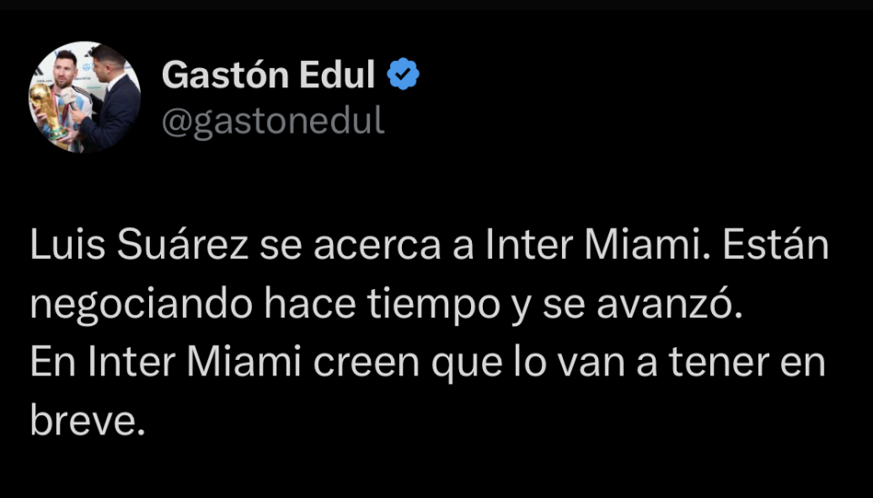 Gastón Edul在个人社交账号上发文透露,苏亚雷斯实际上已经与迈阿密国际进行了很长时间的谈判。而在梅西加盟后,这更加促进交易取得进展。迈阿密国际方面相信,很快就能实现(签下苏亚雷斯的)目标。