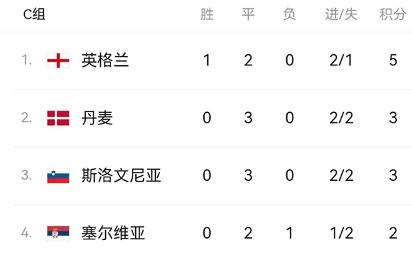 24直播网讯 北京时间6月26日凌晨,欧洲杯C组结束了末轮的2场较量,最终英格兰与斯洛文尼亚、丹麦与塞尔维亚的比赛,全部踢成0-0平。如此一来,本组也出现了一个奇特景象。