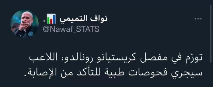 24直播网01月27日讯 据沙特媒体人“Nawaf_Stats”报道,C罗在超级杯比赛中被铲伤,关节肿胀。