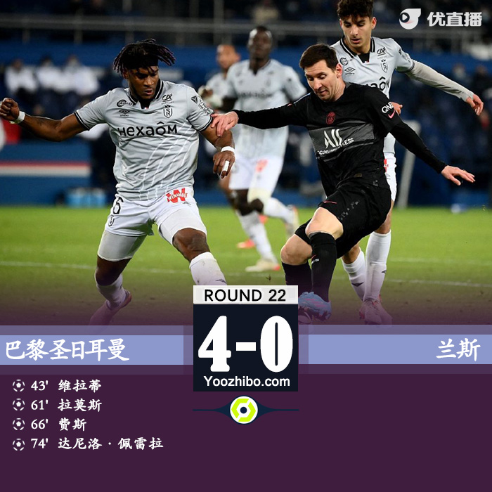 24直播网1月24日讯 北京时间1月24日凌晨03:45,法甲第22轮继续进行,巴黎圣日耳曼主场迎战兰斯。上半场,维拉蒂补射帮巴黎取得领先。下半场,拉莫斯打进处子球扩大比分,梅西替补上场策动维拉蒂制造乌龙球,姆巴佩助佩雷拉再打进一粒乌龙。最终,巴黎4-0大胜兰斯,11分优势领跑积分榜。