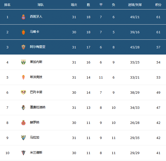 第二是排名积分榜第5名的希洪竞技也出现了平局,放缓了追分脚步,0-0爆冷被阿尔科孔战平,积分只有53分,基本退出前两名的争夺,第四名的莱加内斯则积54分。根据近期战绩,西班牙人2大劲敌莱加内斯、阿尔梅里亚都遭遇了从0-0到1-1的崩盘,两队共计爆出了4大冷门,各自都是三场比赛丢7分,直接失去了直接冲甲的主动权。