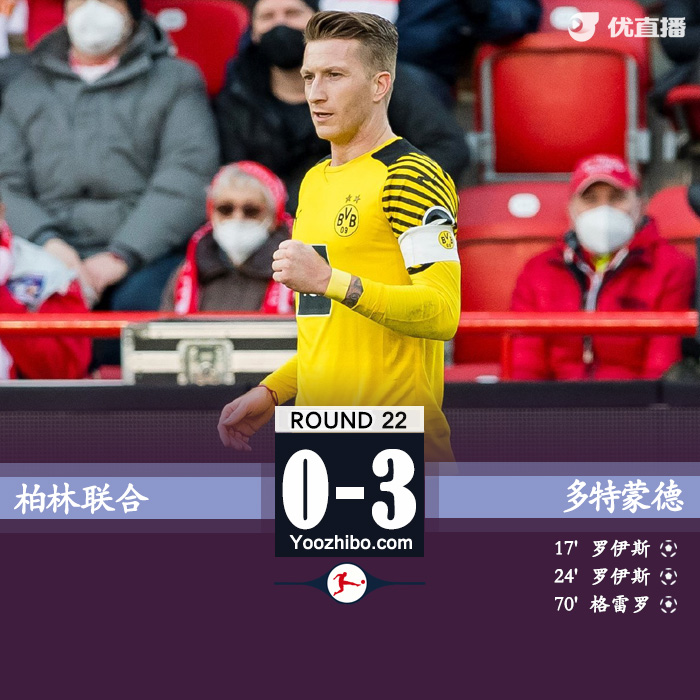 24直播网2月13日讯 北京时间2月13日22:30,德甲联赛第22轮柏林联合主场迎战多特的比赛。上半场罗伊斯禁区低射建功,随后过掉门将破门梅开二度,半场多特客场2-0柏林联。下半场格雷罗补射建功,最终多特客场3比0大胜柏林联。