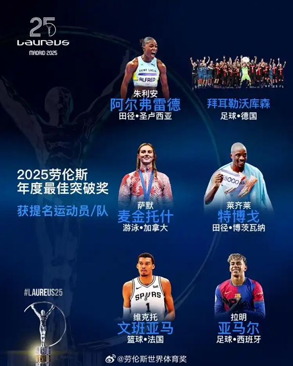 24直播网讯官方消息,2025劳伦斯世界体育奖“年度最佳突破奖”提名,勒沃库森、亚马尔、文班亚马入围,去年这一奖项的获奖者是英格兰足球运动员贝林厄姆。