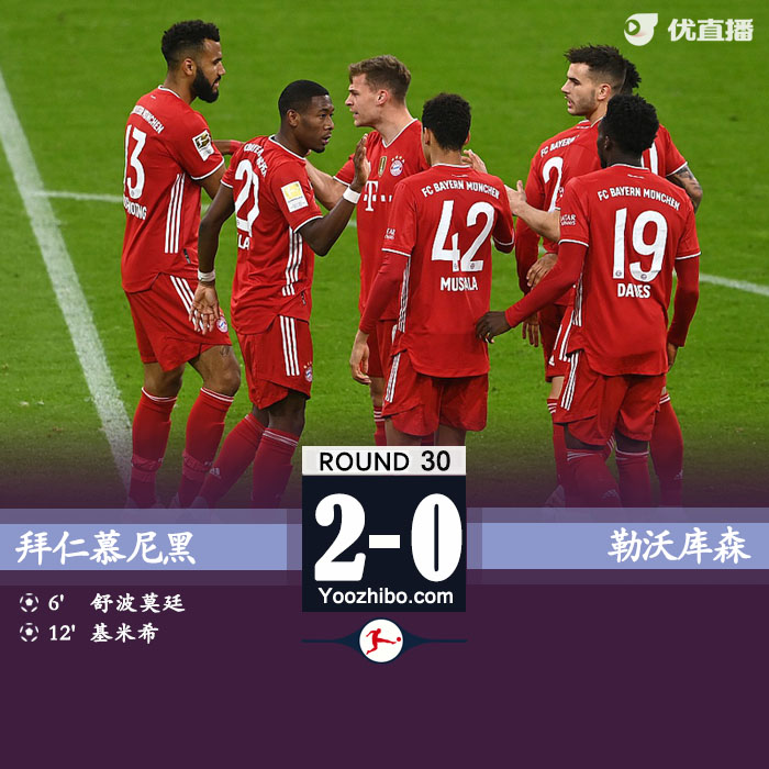 24直播网4月21日讯 北京时间4月21日凌晨2时30分,2020-2021赛季德国甲级联赛第30轮上演一场焦点战役,拜仁慕尼黑坐镇安联球场迎战勒沃库森。上半场,舒波-莫廷破门首开纪录,基米希扩大领先优势。拜仁半场2-0领先勒沃库森。下半场,舒波-莫廷打进一球,但是被判罚越位在先,随后替补上场的贝拉拉比有一次射门击中横梁。最终拜仁慕尼黑主场2-0击败勒沃库森。本轮战罢,拜仁继续排名榜首,领先第二名10分,本赛季德甲还剩下4轮。