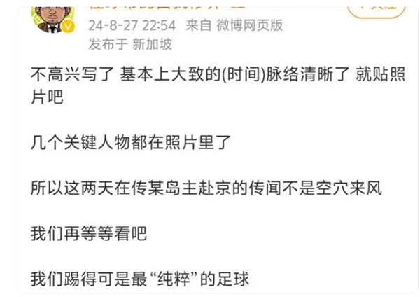 而在近期,媒体人再一次曝光了另一条消息,那就是某豪门名宿已经赶往北京,该媒体人在动态中写道:“这两天在传的某岛主赴京的传闻不是空穴来风。”某岛主为何要赴京呢?名记苗原早已经表态过:只要最终的结果还没有官宣,事情就还有活动的空间。所以某岛主前往足协的举动已经很明确,至于某岛主是谁,在中国足球这个并不难猜。