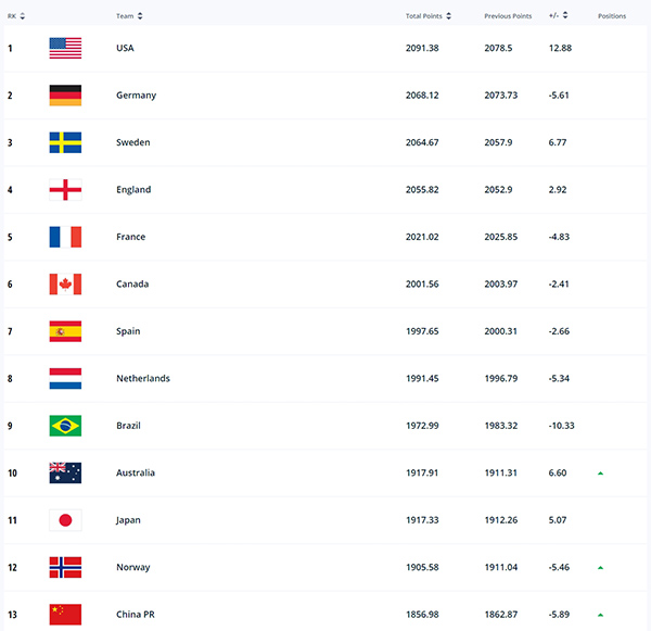 最新一期女足世界排名